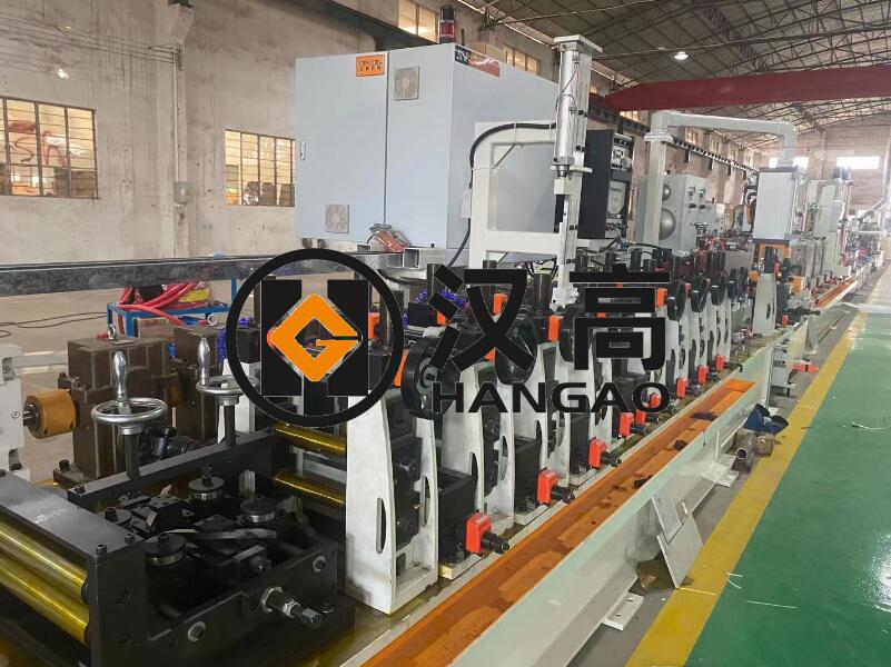 通過上料機將帶料引入焊管機,通過輥輪將帶料擠壓成形,然后用砑弧焊混合氣體保護焊接、校圓,輸出需要長度的管材,切刀機構切斷,再經調直機調直。點焊機用于帶料頭之間進行點焊連接。該型制管機是將帶料連續不斷的焊接成管材,并校圓調直的綜合性的成套設備。